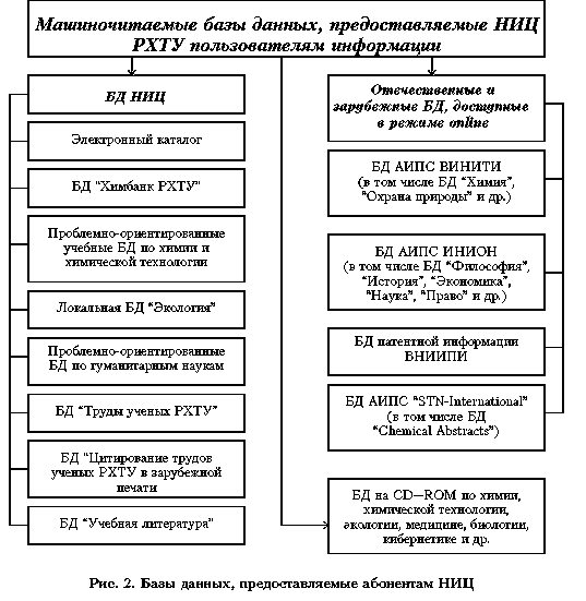 Система НТИ в первую очередь нацелена на информационную поддержку стратегически важных направлений деятельности РХТУ — управление вузом, преподавание общетехнических и специальных дисциплин, гуманитаризацию инженерного образования, организацию самостоятельной работы студентов, научные исследования по важнейшим научно-техническим проблемам, внедрение достижений в производство. Функционирование системы основано на постоянном выявлении, изучении и обобщении информационных потребностей абонентов. На фоне общей тенденции к снижению уровня потребительского спроса и использования информации НИЦ прилагает немало усилий для сохранения высокого уровня ее использования путем повышения качества анализа и своевременного предоставления максимально полной и адекватной информации. Деятельность НИЦ дает возможность руководству вуза, ученым, преподавателям, студентам приобщиться к активному использованию мировых достижений в области химии, химической технологии, смежных отраслей знаний, а также развития высшей школы. На первый план выдвигаются: внедрение новых форм и методов обучения, обеспечивающих повышение степени усвоения профессиональных знаний; организация экономической и экологической подготовки студентов; управление научной политикой вуза, выбор новых направлений исследований, эффективная разработка современных технологий; внедрение новых методов хозяйствования в вузе и т. д. На комплексном информационном обеспечении состоят 90 госбюджетных и 13 хоздоговорных тем по химическому и общетехническому профилю и 39 тем по гуманитарным наукам и проблемам высшей школы. Более 250 абонентов получают в режиме ИРИ, ДОР и ретропоиска 100 тыс. оповещений в год на бумажных носителях и дискетах. Поиск информации ведется как традиционным ручным, так и автоматизированным способами. Автоматизированный поиск осуществляется непосредственно из НИЦ РХТУ в режиме удаленного теледоступа и с терминалов базовых центров НТИ: ВИНИТИ, МЦНТИ, Института автоматизированных систем, ИНИОН РАН, ГПНТБ России, ВНИИ патентной информации, ВНТИЦ, ВНИИ межотраслевой информации, Всероссийской книжной палаты, БЕН РАН, МГУ им. М.В. Ломоносова, ЦНИИ атоминформ, НИИ высшего образования и др. Наибольшее предпочтение научные сотрудники кафедр отдают БД "Химия" ВИНИТИ и БД "Chemical Abstracts" (CAS, США). Должную заинтересованность в получении информации из отечественных и зарубежных баз данных проявляют большинство кафедр и ряд коммерческих структур при РХТУ (торговый дом "Химбизнес", малое государственное предприятие "Технотоп" и др.). С 1992 г. на базе инфраструктуры сети Relcom в НИЦ функционирует служба "Электронная почта и телеконференции", которая приобретает все большую популярность. 200 абонентов системы (преподаватели, научные сотрудники) имеют возможность оперативно обмениваться информацией и почтовыми сообщениями с российскими и зарубежными коллегами, а также принимать участие в различных телеконференциях компьютерных сетей Relcom (отечественных) и Usenet (иностранных). Открыты удаленные узлы "Электронной почты" на отдельных факультетах и кафедрах. В 1993 г. сделаны первые шаги по интеграции НИЦ РХТУ в единую информационную сеть вузов Москвы: организован выделенный телефонный канал в Научную библиотеку МГУ им. М.В. Ломоносова, предназначенный для обмена библиогр