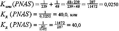 Приведем конкретные расчеты интегрального показателя Кипи для двух журналов ЦБ БЕН РАН в 1992 г. Например, журнал "Nature" (N) в течение года заказывался 492 раза представителями 67 институтов РАН, а журнал "Proceedings of the National Academy of Science of USA" (PNAS) 293 раза представителями 48 институтов. Соответственно этим данным их индексы Кипи и Кд рассчитываются так: