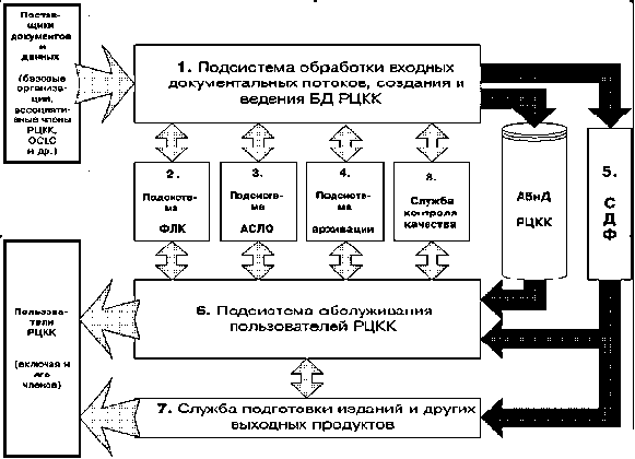 - действующей при ГПНТБ России Автоматизированной системы Сводного каталога по научно-технической литературе, а в РКП - Системы централизованной каталогизации как исходной технологической основы создания РЦКК. (Здесь следует отметить также опыт взаимодействия и работы базовых организаций АС РСвК по поставке информации и совместному созданию распределенного адресно-справочного библиографического банка данных научно-технической литературы РГБ, РНБ, БЕН РАН, ЦНСХБ, ГЦНМБ и других библиотек и организаций страны.);