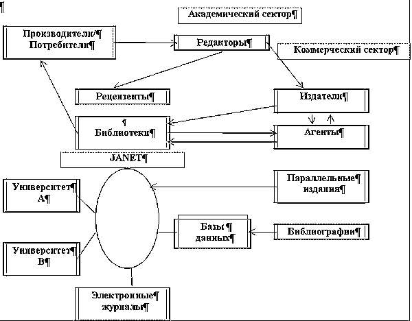 При подготовке академических журналов интеллектуальный продукт производится в академическом секторе. Авторы, редакторы и рецензенты - это обычно ученые, работающие в университетах. На коммерческой стороне процесса подготовки - издатели и агенты, занимающиеся реальным производством, оформлением ("упаковкой") интеллектуального продукта, маркетингом, хранением и распространением. Во многих, если не в большинстве случаев ученые получают очень незначительное вознаграждение за свои работы либо вообще не получают такового; оно достается издателям, которые, оформив надлежащим образом работы ученых, продают их представителям академического сектора и таким образом получают двойную выгоду. Обращаясь к электронной инфраструктуре, покажем ситуацию в Великобритании, где она хорошо развита. Заслуживает внимания тот факт, что коммерческие издательства мало занимаются производством полностью электронных журналов. Тенденция такова: чисто электронные журналы готовятся учеными, а коммерческие издательства выпускают издания параллельно в электронной и традиционной печатной форме. Наиболее важной для будущего электронных публикаций является научная и интеллектуальная часть подготовки публикаций, которая точно соответствует электронной инфраструктуре и поддерживается ею. Приложив немного изобретательности и усилий, ученые, пользующиеся сетями, смогут организовать оформление и распространение научных работ, которые сейчас выполняются издателями традиционной печатной продукции. Многих из нас интересует вопрос: сохранится ли в будущем роль коммерческих издательств или научное сообщество само станет заниматься публикацией своего интеллектуального продукта? Ясно, что мы переживаем период фундаментальных изменений, касающихся процессов хранения, публикации и распространения результатов исследований. Как обычно бывает в такие периоды, старые структуры некоторое время сохраняются, затем заменяются новыми. Сейчас наблюдается сохранение структур, ориентированных на печатный вариант электронных журналов. Далее предлагаем отвлечься от существующей структуры и рассмотреть новую модель, основанную на свойствах электронной инфраструктуры.