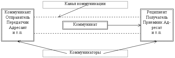 Начнем с определения социальной коммуникации. А.В. Соколов предваряет его определением коммуникации вообще: "разновидность взаимодействия между субъектами, опосредованного некоторым объектом" [1, с.18]. Однако в этой трактовке неправомерно "коммуникация вообще" сводится к коммуникации между субъектами, т. е. людьми или животными. С другой стороны, в этом определении не показано, что взаимодействие осуществляется путем передачи некоторого объекта по каналу связи между взаимодействующими субъектами (или все-таки объектами? Точнее - между коммуникаторами, коммуникантом и реципиентом, отправителем и получателем, передатчиком и приемником и т. п.). В этом смысле коммуникация может осуществляться не только в человеческом обществе или в животном мире, но и в технике (т. е. в мире "второй природы", созданной человеком). Как коммуникационные могут рассматриваться и некоторые взаимодействия в неживой природе, если исследователь применит к ним основные положения теории коммуникации. Иначе говоря, коммуникация вообще - это связь между коммуникантом и реципиентом, в которой осуществляется передача некоторого объекта (коммуниката) по каналу коммуникации, реальному или воображаемому.